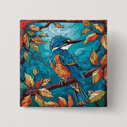 Capture the beauty of nature with the Autumn Kingfisher Button, featuring a stunning depiction of a kingfisher surrounded by warm autumn hues in elegant stained glass style. The intricate detailing and rich colors make it a tiny masterpiece you can wear.